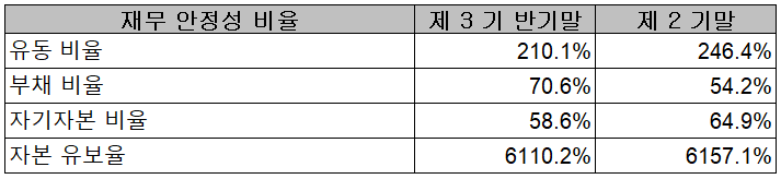 2021년 6월 30일 기준 재무 안정성 비율에서는 유동비율 210.1%, 부채비율 70.6%, 자기자본비율 58.6%, 자본유보율 6,110.2%를 기록하면서 안정적인 재무상태를 유지하고 있습니다.