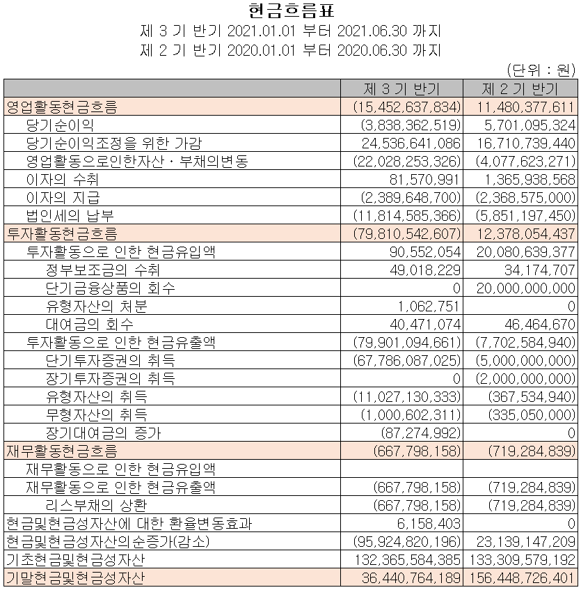 2021년 상반기 말 기준 영업활동 현금흐름에서는 운전자산의 변동과 상반기 순손실에 따라 총 155억 원의 현금이 유출되었습니다. 투자활동에서는 단기 투자증권의 취득과 유무형 자산의 취득으로 798억 원의 현금이 유출되었습니다. 2021년 6월 30일 기준 현금 및 현금성 자산은 전년 동기 말보다 1,200억 원이 감소한 364억 원을 기록하고 있습니다.