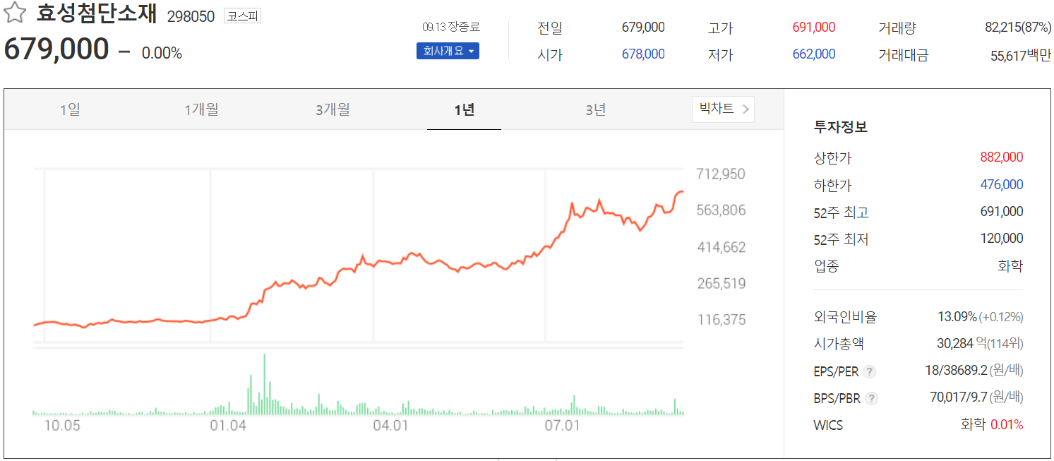 9월 13일 장 종료 기준 당사의 주가는 전거래일 대비 같은 종가인 679,000원에 거래를 마감했습니다. 외국인 비중은 13.09%이며, 시가 총액 3조 284억 원으로 코스피 시총 기준 114위 종목입니다.