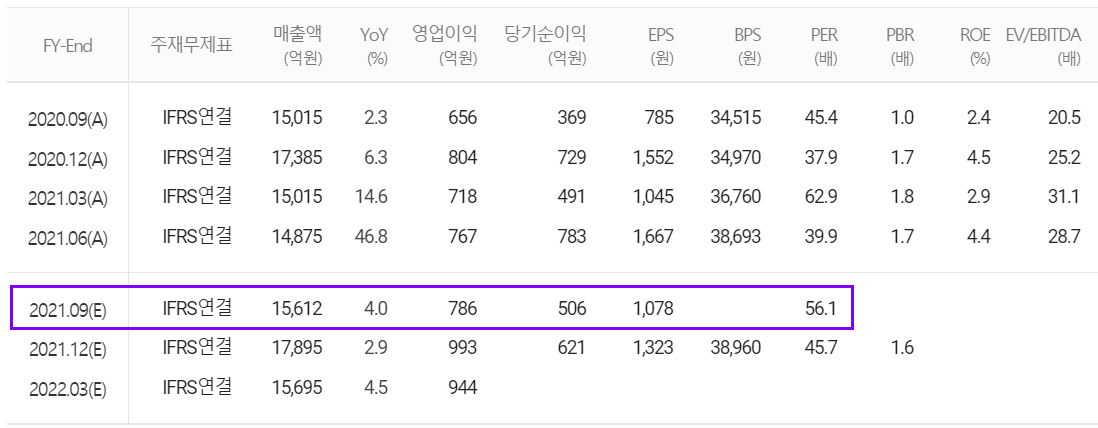 당사의 2021년 3분기 예상실적은 매출액 1조 5,612억 원으로 전년 동기 대비 4% 증가하고, 영업이익은 786억 원으로 2.5% 증가할것으로 추정했습니다.