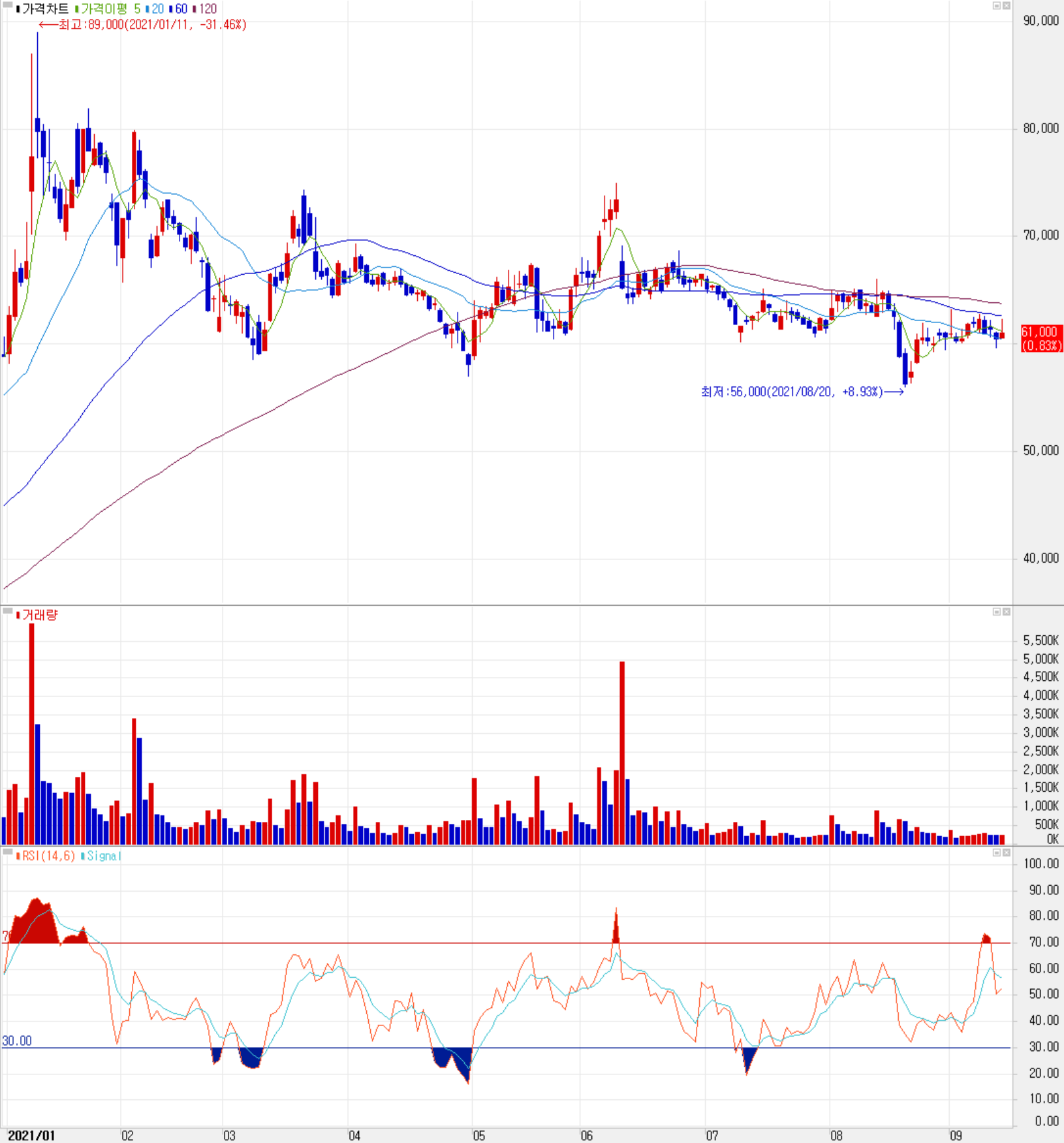 9월 14일 장 종료 기준 당사의 주가는 전일보다 0.83% 오른 61,000원에 거래를 종료했습니다. 외국인 비중은 25.06%를 기록하였으며, 시가 총액은 2조 8,644억 원으로 코스피 시총 기준 125위 종목입니다.