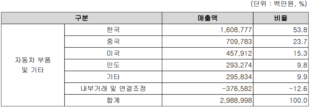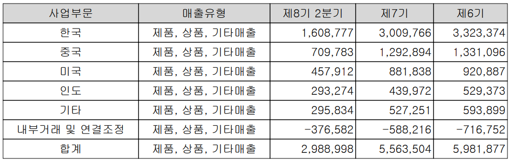 지난 상반기 지역별 매출에서는 내수(한국)가 1조 6,088억 원으로 전체 매출의 53.8%를 차지하였으며, 중국은 7,098억 원으로 23.7%, 미국은 4,579억 원으로 15.3%, 인도는 2,933억 원으로 9.8%의 매출 비중을 기록했습니다.