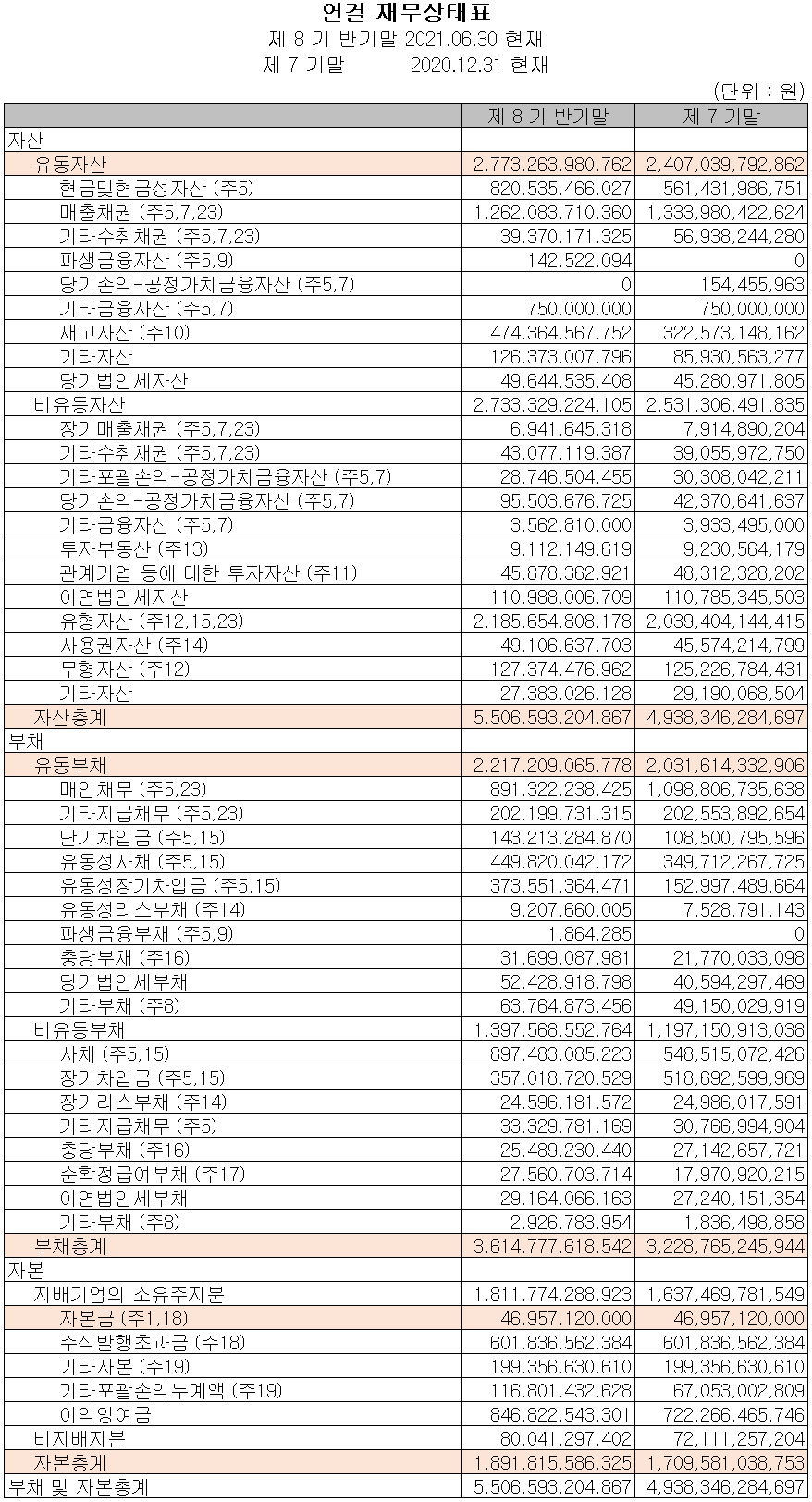 지난 상반기 당사의 자산 총계는 전기 말보다 11.5% 증가한 5조 5,066억 원으로 현금 및 현금성 자산, 재고자산 그리고 유형자산의 증가에 기인합니다. 부채 총계는 12% 증가하면서 3조 6,148억 원으로 유동성 사채, 장기차입금 등의 증가가 있었습니다.