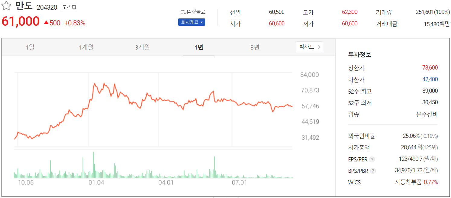 9월 14일 장 종료 기준 당사의 주가는 전일보다 0.83% 오른 61,000원에 거래를 종료했습니다. 외국인 비중은 25.06%를 기록하였으며, 시가 총액은 2조 8,644억 원으로 코스피 시총 기준 125위 종목입니다.