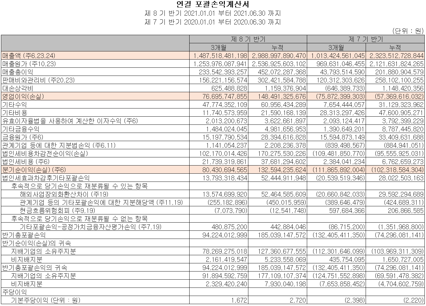 당사의 지난 2분기 실적은 매출액 1조 4,875억 원으로 전년 동기 대비 46.8% 증가했고, 영업이익은 767억 원 당기순이익은 804억 원으로 흑자 전환했습니다. 또한 2분기도 차량용 반도체 공급 부족 상황이었으나 시장 예상치를 상회하였으며, 당기 중 인수한 만도헬라의 실적 등으로 수익률도 상승하였고 상반기 누적 기준 실적으로도 흑자 전환하였습니다. 2분기 호실적의 주 요인에는 기존 사업의 꾸준한 실적 외에 xEV 관련 부품의 수요 증가 및 OEM 벤더로의 자동 주차(ADAS) 솔루션이 처음으로 공급되었습니다.