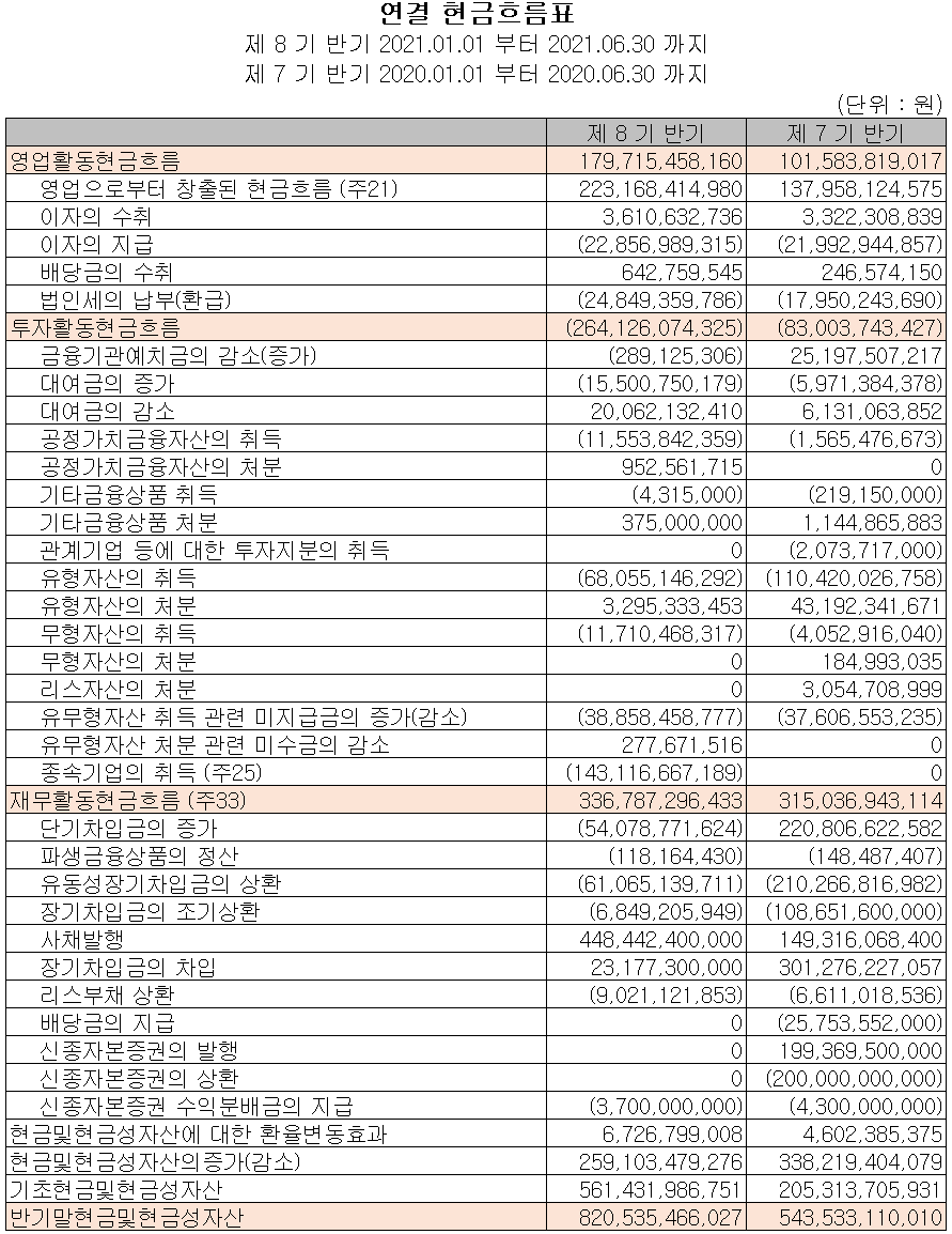 2021년 6월 30일 현재 영업활동 현금흐름에서는 수익의 증가 등 영업으로 창출된 현금을 바탕으로 총 1,797억 원의 현금이 유입되었습니다. 투자활동에서는 공정가치금융자산 및 유무형 자산의 취득으로 2,641억 원의 현금이 유출되었습니다. 재무활동에서는 차입금을 조달하여 당기 부채를 상환하였습니다. 2021년 상반기 말 기준 현금 및 현금성 자산은 전기 말 대비 2,770억 원이 증가한 8,205억 원을 보유하고 있습니다.