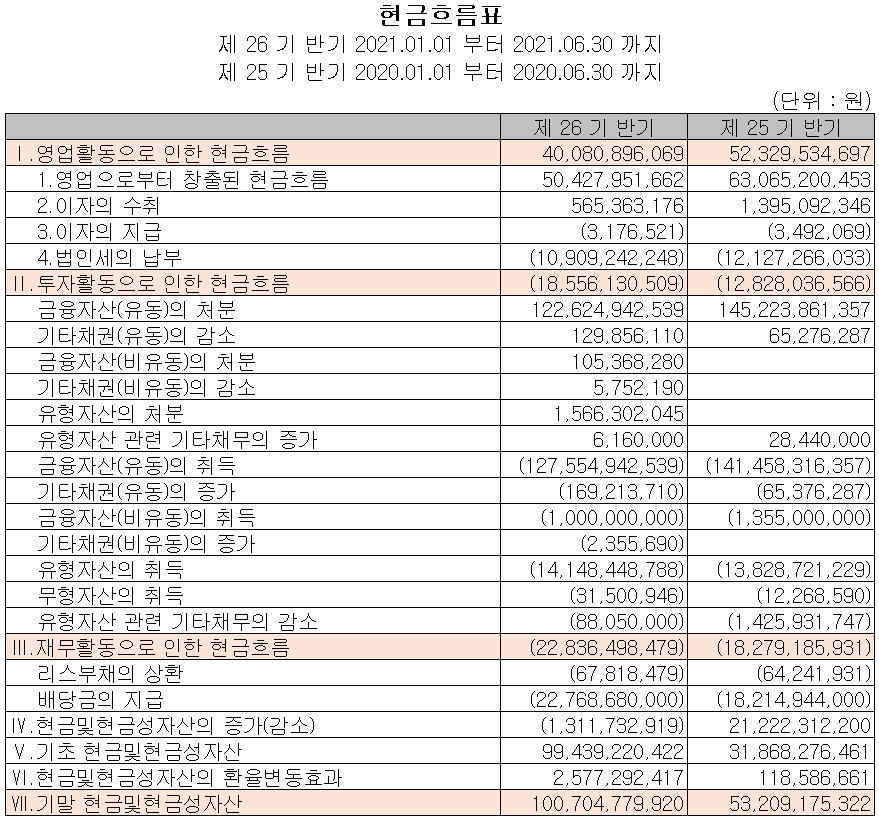 지난 상반기 영업활동 현금흐름에서는 401억 원의 현금이 유입되었으며, 투자활동에서는 비유동 금융자산의 취득, 유형자산의 취득으로 186억 원의 현금이 유출되었습니다. 재무활동에서는 리스부채를 상환하고, 배당금을 지급하였습니다. 2021년 상반기 말 기준 현금 및 현금성 자산은 1,007억 원을 보유하고 있습니다.