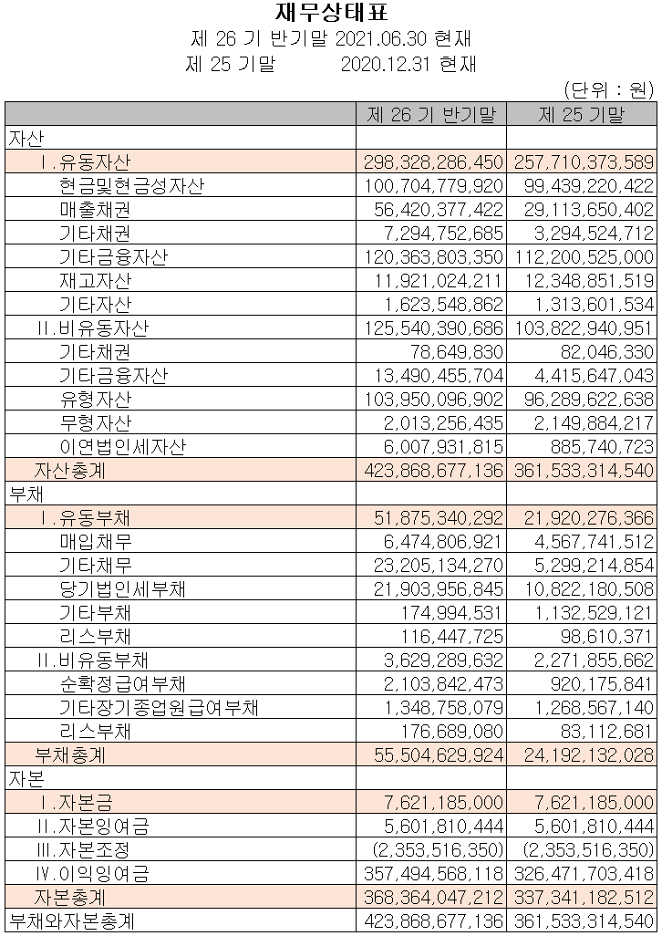 지난 상반기 말 현재 자산 총계는 전기 말보다 17.2% 증가한 4,239억 원으로 매출채권, 기타금융자산 및 유형자산의 증가에 기인합니다. 부채 총계는 129.4%(313억 원) 증가한 555억 원으로 기타 채무(유형자산의 미지급비용 등)의 증가가 있었습니다. 꾸준한 실적으로 잉여금이 증가하였으며, 자본총계는 310억 원이 증가한 3,684억 원을 기록했습니다.
