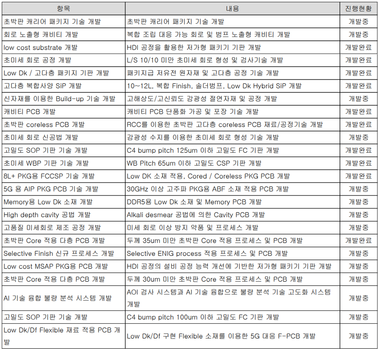 당사는 지난 상반기 매출액의 0.97%인 45억 원 규모의 비용을 연구개발에 투입하면서 초박판 캐리어 패키지 기술 개발, 회로 노출형 캐비티 개발 등 신제품 및 고객사 대응 제품의 개발을 지속하고 있습니다.