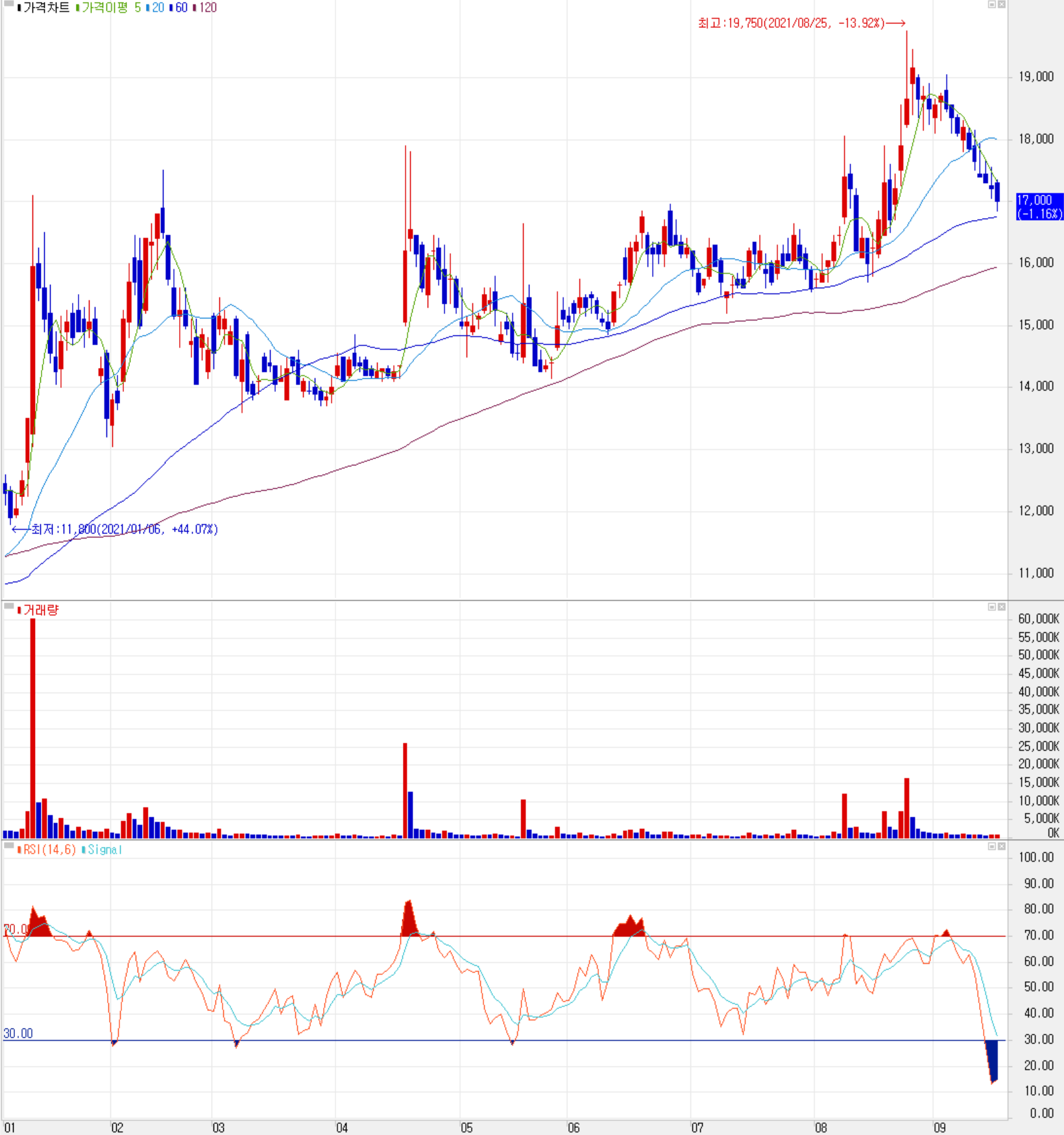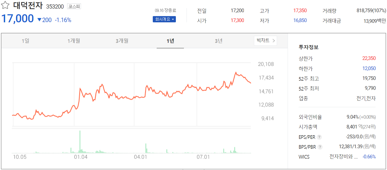 9월 16일 장 종료 기준 당사의 주가는 전일보다 1.16% 내린 17,000원에 거래를 마쳤습니다. 외국인 비중은 9.04%이며, 시가 총액 8,401억 원으로 코스피 시총 기준 274위 종목입니다.