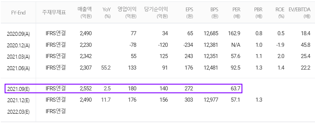 2021년 3분기 예상실적은 매출액 2,552억 원으로 전년 동기 대비 2.5% 증가하고, 영업이익은 180억 원으로 133.8% 증가할 것으로 추정했습니다.