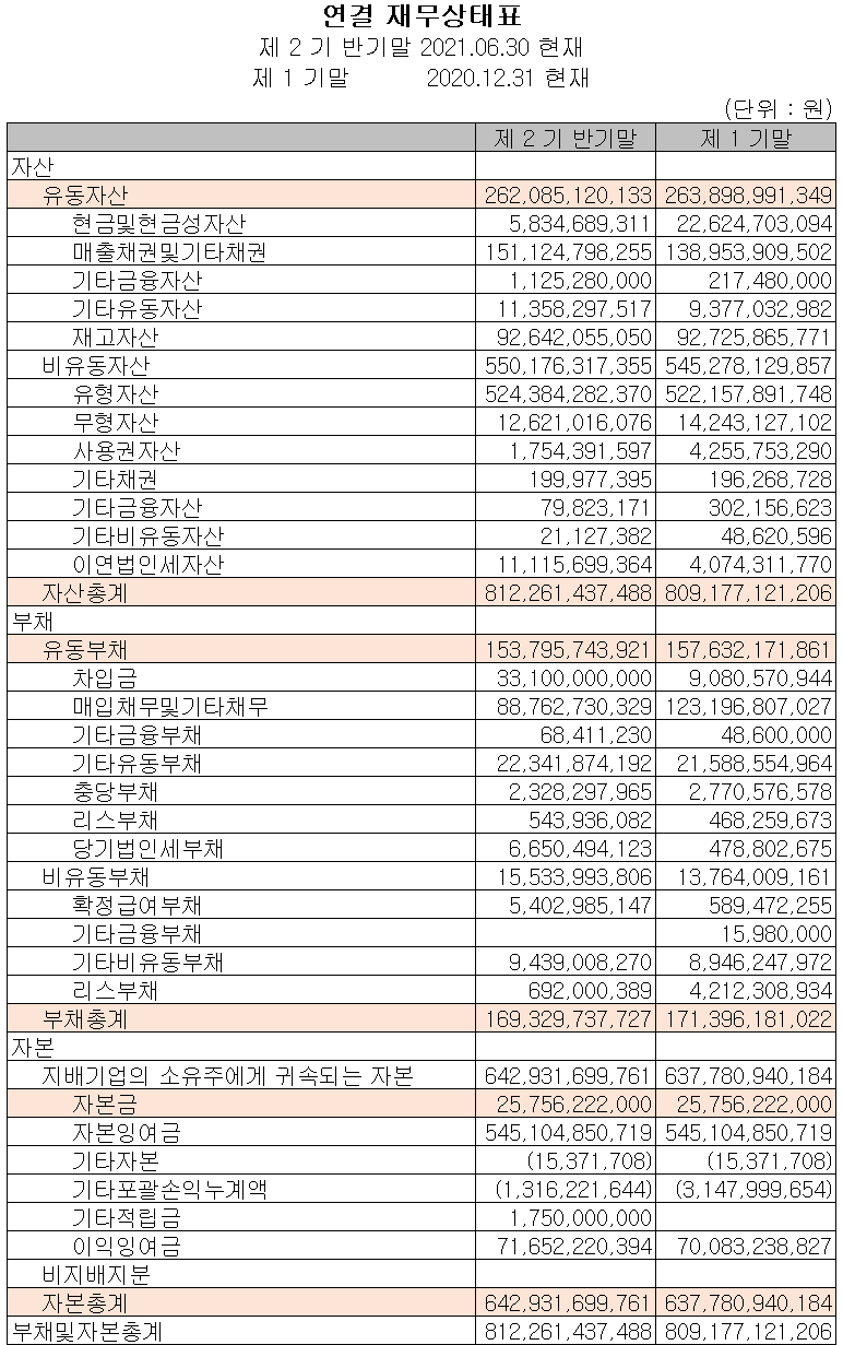 2021년 6월 30일 현재 자산 총계는 전기 말보다 0.4% 증가한 8,123억 원이며, 부채 총계는 1.2% 감소한 1,693억 원을 기록하면서 당기 중 자산과 부채의 큰 변동은 없습니다. 자기 자본은 0.8% 증가한 6,429억 원을 기록했습니다.