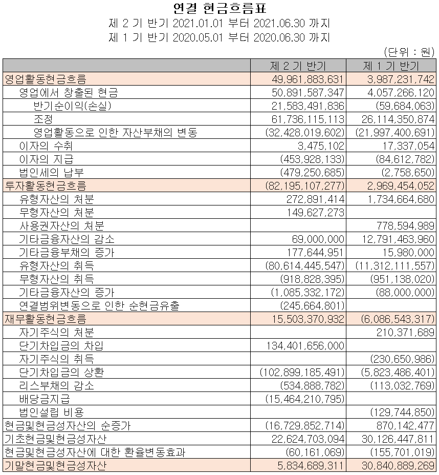 2021년 상반기 영업활동 현금흐름에서는 이익의 증가 등 영업활동에서 창출된 현금으로 총 500억 원의 현금이 유입되었습니다. 투자활동에서는 반도체 PCB에 대한 투자로 유무형 자산을 취득하면서 822억 원의 현금이 유출되었습니다. 재무활동에서는 차입금을 조달하여 당기 부채를 상환하고, 배당금을 지급하였습니다. 2021년 6월 30일 기준 현금 및 현금성 자산은 58억 원을 보유하고 있습니다.
