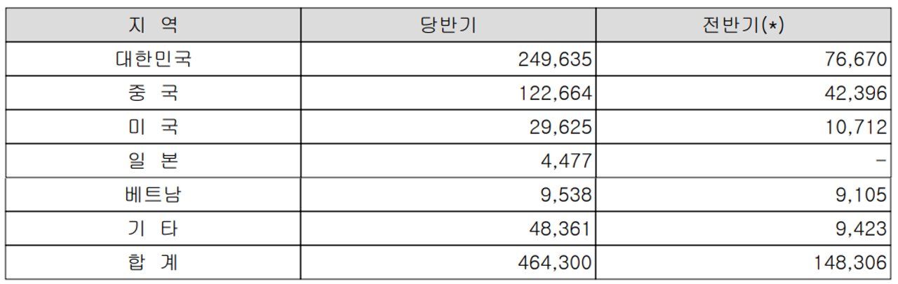 지난 상반기 내수 부문의 매출은 2,496억 원으로 전체 매출의 53.8%를 차지하였으며, 중국은 1,227억 원으로 26.4%, 미국은 296억 원으로 6.4%의 매출 비중을 나타냈습니다.