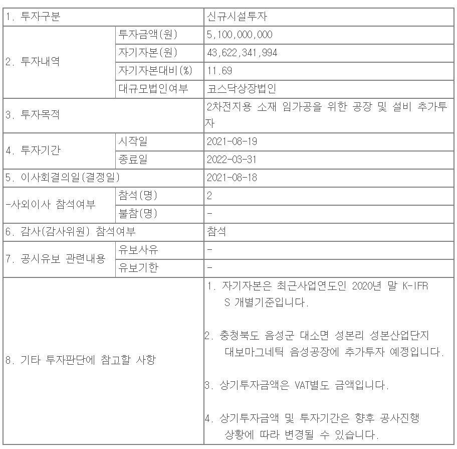 대보마그네틱(290670)은 51억원 규모로 신규시설투자에 나선다고 18일 공시했다. 투자 목적은 “2차전지용 소재 임가공을 위한 공장 및 설비 추가투자”로, 투자 기간은 2022년 3월 31일까지다.
