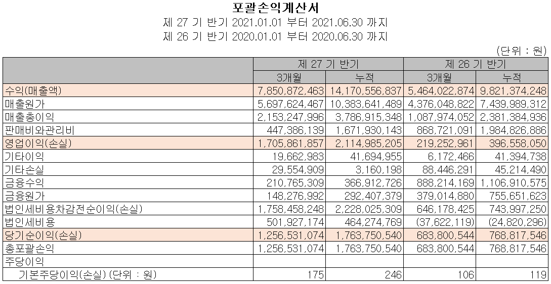 2021년 2분기 당사의 실적은 매출액 79억 원으로 전년 동기 대비 43.7% 증가했고, 영업이익은 17억 원으로 678% 증가, 당기순이익은 13억 원을 기록하면서 83.8% 증가하였습니다. 코로나19로 인한 기저효과 및 2차전지의 성장으로 당사의 주력 제품인 탈철기의 수요가 증가하면서 전체 실적을 견인했습니다.