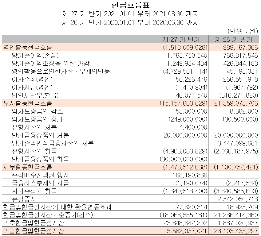 2021년 6월 30일 기준 영업활동 현금흐름에서는 운전자산(매출채권, 재고자산의 증가 등)의 변동에 따라 15억 원의 현금이 유출되었습니다. 투자활동에서는 유형자산 및 단기금융상품의 취득으로 152억 원의 현금이 유출되었습니다. 재무활동에서는 자기 주식을 취득하고 당기 부채를 상환하면서 15억 원의 현금이 유출되었습니다. 2021년 상반기 말 기준 현금 및 현금성 자산은 56억 원을 보유하고 있습니다.