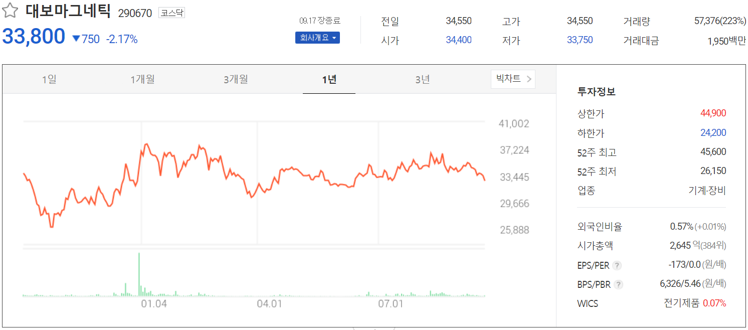 9월 17일 장 종료 기준 당사의 주가는 전 거래일보다 2.17% 내린 33,800원에 거래를 마쳤습니다. 외국인 비중은 0.57%이며 시가 총액 2,645억 원으로 코스닥 시총 기준 384위 종목입니다.