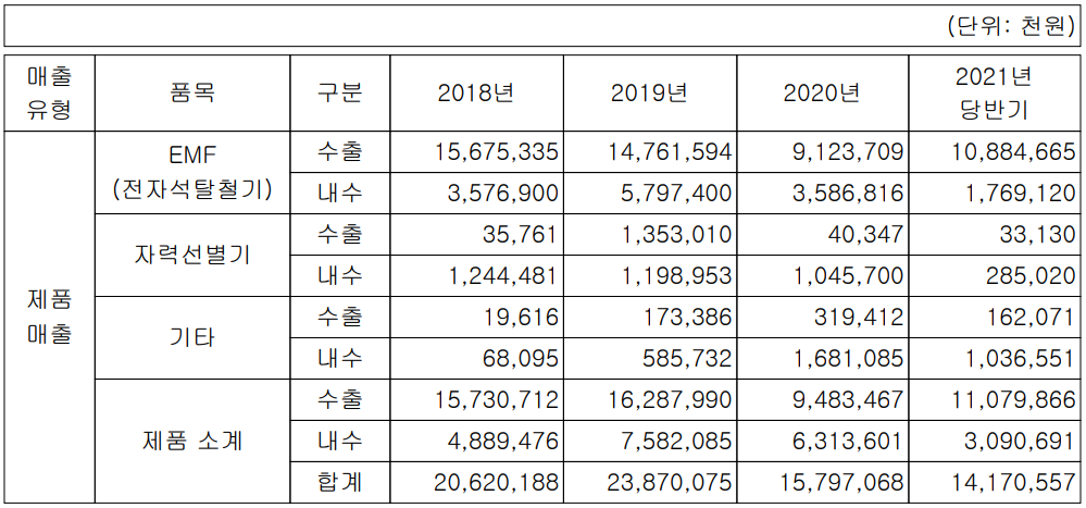 지난 상반기 전자석 탈철기의 매출은 127억 원으로 전체 매출의 89.3%를 차지하였으며, 자력선별기는 3억 원으로 2.2%의 매출 비중을 기록했습니다.
