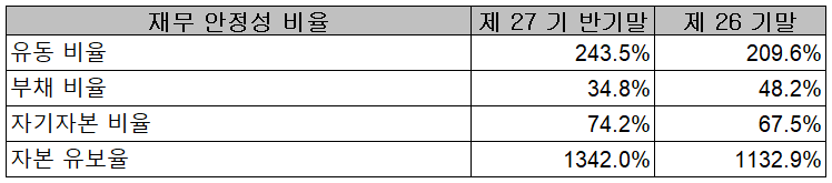 2021년 상반기 말 기준 재무안정성 비율에서는 유동비율 243.5%, 부채비율 34.8%, 자기자본비율 74.2%, 자본유보율 1,342%를 기록하면서 건실하고, 안정적인 재무상태를 유지하고 있습니다.