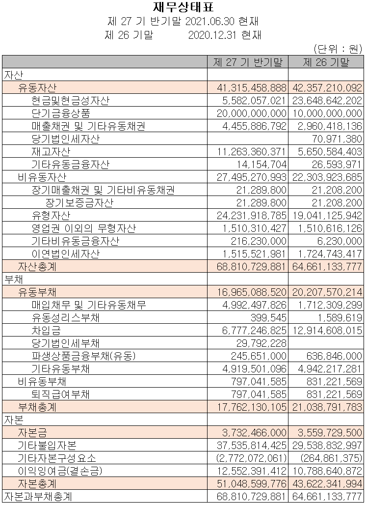 지난 상반기 말 자산총계는 전기 말보다 6.4% 증가한 688억 원으로 단기금융상품, 매출채권, 재고자산 및 유형자산의 증가에 기인합니다. 부채총계는 15.6% 감소한 178억 원으로 매입채무는 증가했으나, 차입금의 감소가 있었습니다. 자본총계는 2020년 하반기 실시한 유상증자로 25억 원, 전환사채의 보통주 전환으로 기타불입자본이 증가하면서 전기 대비 41억 원이 증가한 510억 원을 기록했습니다.