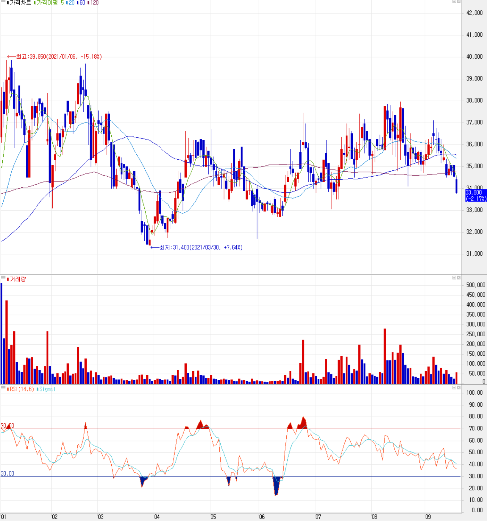 당사의 주가는 지나 5월부터 6월까지 조정을 받은 후 꾸준한 수주 실적과 2차전지 소재 임가공 사업의 성장 소식과 함께 상승했으나 주가 상승을 이끌었던 기관의 매도가 이어지면서 33,800원까지 하락한 상태입니다. 최근 수급에서는 기관의 매도에 9월 17일을 제외한 9 거래일 연속 순매수했던 개인의 공방이 치열한 모습입니다. 예상 실적 및 차트 소견을 종합한 개인적인 목표주가는 43,000원으로 설정하였습니다.