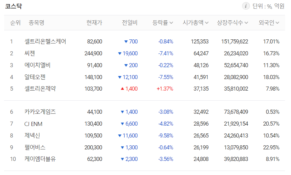 코스닥 시가총액 상위 10개 종목 중 셀트리온제약(+1.37%) 외에 모든 종목이 하락 마감했습니다.