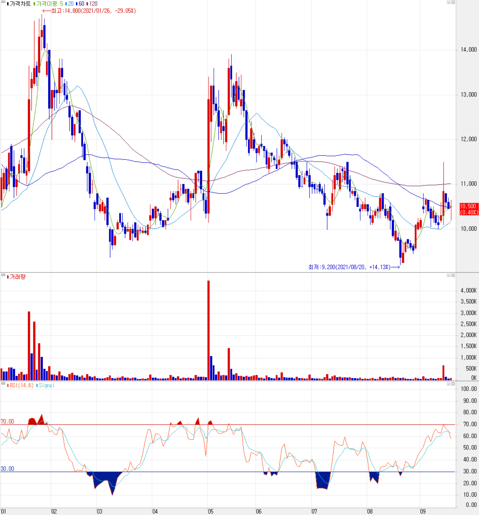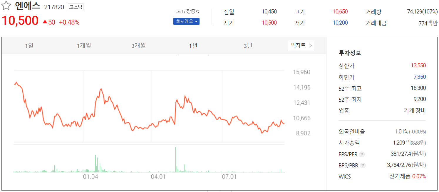 9월 17일 장 종료 기준 당사의 주가는 전 거래일 대비 0.48% 오른 10,500원에 거래가 종료됐습니다. 외국인 비율은 1.01%이며, 시가 총액 1,209억 원으로 코스닥 시총 기준 828위 종목입니다.