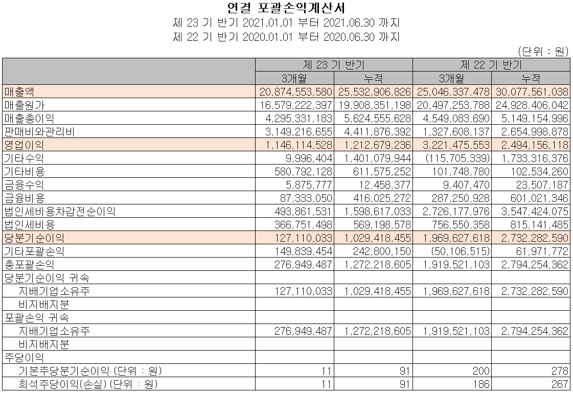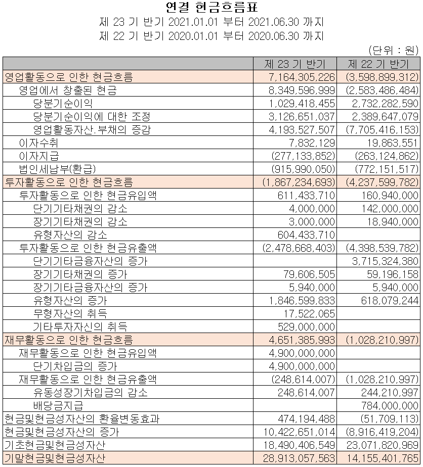 지난 상반기 영업활동 현금흐름에서는 운전자산의 변동 및 순이익으로 총 72억 원의 현금이 유입되었습니다. 투자활동에서는 유형자산의 취득과 기타투자자산(관계기업 투자 등)의 취득으로 19억 원의 현금이 유출되었습니다. 재무활동에서는 차입금을 조달하여 당기 부채를 상환하였습니다. 2021년 6월 30일 기준 현금 및 현금성 자산은 289억 원을 보유하고 있습니다.