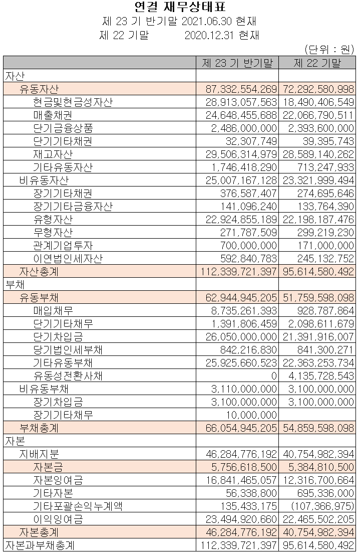 2021년 상반기 말 기준 자산총계는 전기 말보다 17.5% 증가한 1,123억 원으로 현금 및 현금성 자산, 매출 채권, 재고자산, 유형자산 및 관계기업 투자 자산 등의 증가에 기인합니다. 부채총계는 20.4% 증가한 661억 원으로 매입채무 및 단기차입금의 증가가 있었습니다.