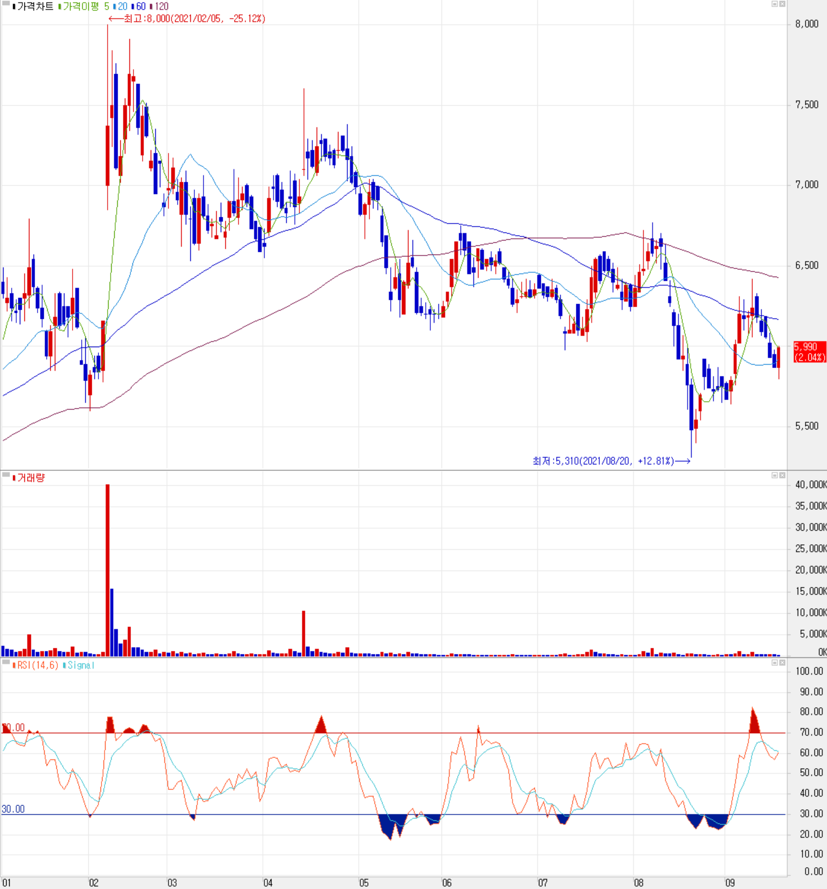 9월 17일 장 종료 기준 당사의 주가는 전 거래일보다 2.04% 오른 5,990원으로 거래를 마감했습니다. 외국인 비율은 0.5%이며 시가 총액 4,915억 원으로 코스닥 시총 기준 186위 종목입니다.