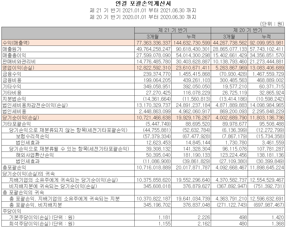 2021년 2분기 당사의 실적은 매출액 774억 원으로 전년 동기 대비 74.8% 증가했고, 영업이익은 128억 원으로 143.6% 증가, 당기순이익은 107억 원으로 167.9% 증가했습니다. 지난 상반기에는 특히 주력 제품인 스크러버의 매출이 크게 증가하면서 전체 실적을 이끌었습니다.