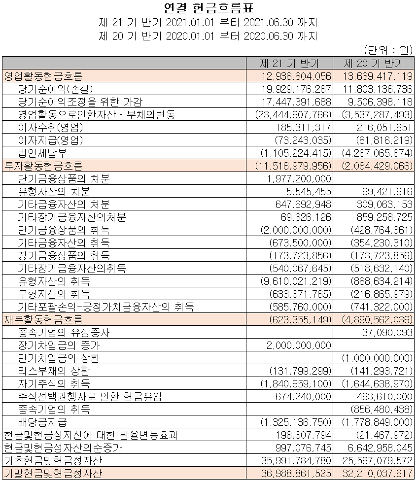 지난 상반기 영업활동 현금흐름에서는 순이익의 증가 및 조정에 따라 129억 원의 현금이 유입되었으며, 투자활동에서는 단기금융상품의 취득 및 유무형 자산의 취득으로 115억 원의 현금이 유출되었습니다. 재무활동에서는 차입금을 조달하여 자기 주식을 취득하였으며, 배당금을 지급하면서 6억 원의 현금이 유출되었습니다. 2021년 상반기 말 기준 현금 및 현금성 자산은 370억 원을 보유하고 있습니다.