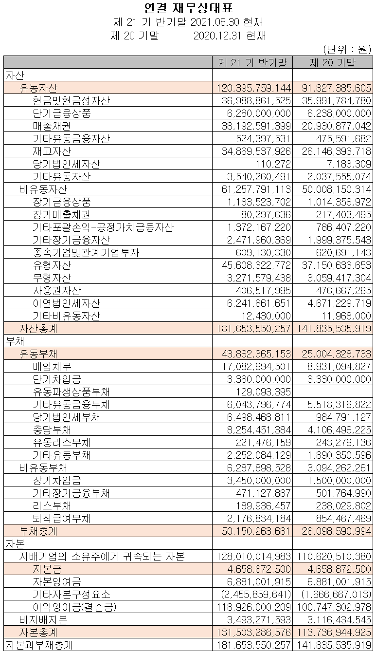 2021년 상반기 말 기준 자산총계는 전기 말보다 28.1% 늘어난 1,817억 원으로 현금 및 현금성 자산, 매출채권, 재고자산 및 유형자산의 증가에 기인합니다. 부채총계는 78.5% 증가한 502억 원으로 매입채무, 충당부채 및 장기차입금의 증가가 있었습니다. 자기자본은 실적 호조에 따른 이익잉여금의 증가로 15.6% 늘어난 1,315억 원을 기록했습니다.