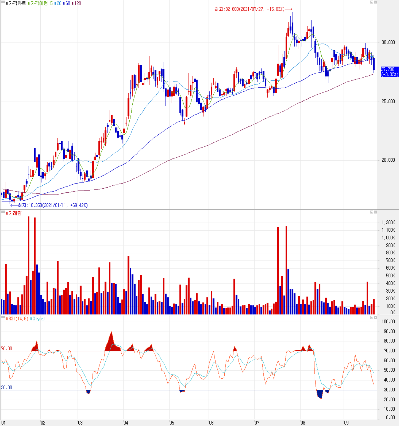 최근 당사의 주가는 8월 중순 변동성에 따른 하락 이후 27,000~30,000원 사이에서 등락을 반복하는 상황을 보이고 있습니다. 최근 한 달간 수급에서는 기관이 매수우위를 보인 가운데 외국인과 개인은 매도세가 강한 모습입니다. 예상실적 및 차트 소견을 종합한 개인적인 목표주가는 34,000원으로 설정하였으나, 최근 중국발 헝다 이슈가 남아있는 상황과 말레이시아 델타 변이 확산으로 차량용 반도체 부족 현상이 지속되는 등으로 예상 손절가를 명확히 한 후 진입하는 게 좋겠습니다. 중장기적으로는 양호한 재무상태에 독자기술 기반으로 미중 무역 분쟁에 따른 기회 등 당분간 성장 가능성이 충분한 기업으로 투자매력이 있는 기업으로 판단합니다.