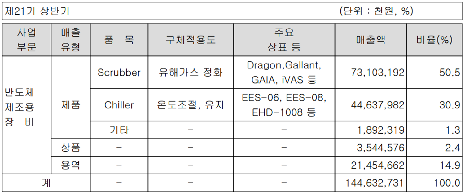 당사는 반도체 제조 공정용 장비를 개발, 공급하는 단일 사업부문으로 세부적으로는 반도체 제조 공정 중 발생하는 유해가스를 정화하는 스크러버(Scrubber)와 온도조절 및 일정 수준의 온도를 유지해주는 칠러(Chiller) 장비 등이 있습니다. 또한 종속회사에는 반도체 설비 부품 및 콜드체인 시스템을 생산하는 (주)이에스티가 있습니다. 지난 상반기 스크러버의 매출은 731억 원으로 전체 매출의 50.5%를 차지하였으며, 칠러는 446억 원으로 30.9%의 매출 비중을 기록했습니다. 상반기 전체 매출에서 수출은 794억 원으로 54.9%, 내수는 652억 원으로 45.1%의 비중을 나타냈습니다.