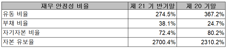 지난 상반기 말 기준 재무 안정성 비율에서는 유동비율 274.5%, 부채비율 38.1%, 자기자본비율 72.4%, 자본유보율 2700.4%를 기록하면서 전반적으로 건실하고 안정적인 재무상태를 유지하고 있습니다.