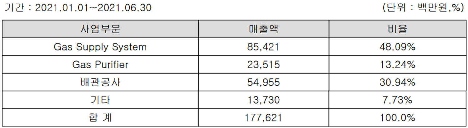 당사는 사업지주회사로서 14개의 종속회사 외에 반도체 및 디스플레이 공정에 필요한 특수 가스를 공급하는 Gas Supply System, 특수 가스에 포함된 불순물을 제거하는 장치인 Gas Purifier 및 가스 및 화학제품을 안전하게 운반할 수 있는 배관 공사 등의 사업을 영위하고 있습니다. 지난 상반기 별도 기준으로 Gas Supply System의 매출은 854억 원으로 전체 매출의 48.09%를 차지하였으며, Gas Purifier는 235억 원으로 13.24%, 배관 공사는 550억 원으로 30.94%의 매출 비중을 기록했습니다.