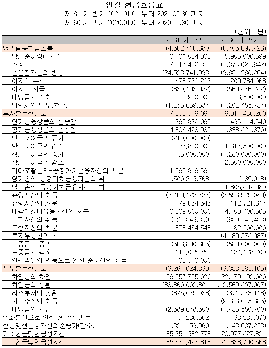 지난 상반기 영업활동 현금흐름에서는 당기순이익 및 조정에 따른 유입이 있었으나, 운전자산(매출채권 및 재고자산의 증가 등)의 변동에 따라 46억 원의 현금이 유출되었습니다. 투자활동 현금흐름에서는 유형 자산의 취득이 있었으나 장기금융상품 및 매각예정비유동자산의 증가로 75억 원의 현금이 유입되었습니다. 재무활동에서는 차입금을 조달하여 당기 부채를 상환하였으며, 배당금을 지급하면서 33억 원의 현금이 유출되었습니다. 2021년 상반기 말 기준 현금 및 현금성 자산은 전년 동기 말보다 56억 원이 증가한 354억 원을 보유하고 있습니다.