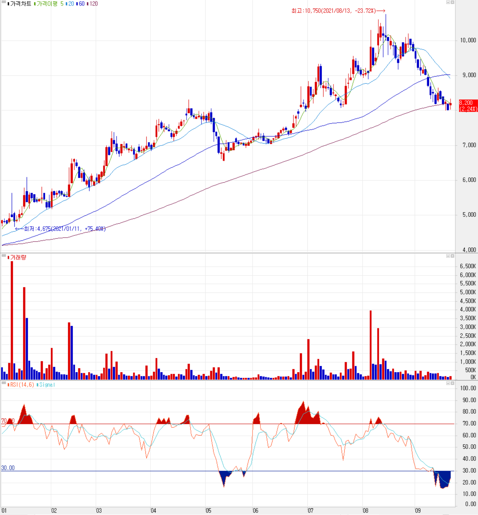 9월 24일 장 종료 기준 당사의 주가는 전 거래일보다 2.24% 오른 8,200원에 거래를 마쳤습니다. 외국인 비율은 8.08%이며 시가총액 2,583억 원으로 코스닥 시총 기준 556위 종목입니다.