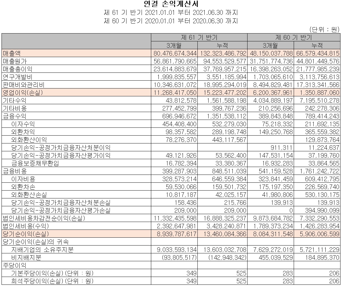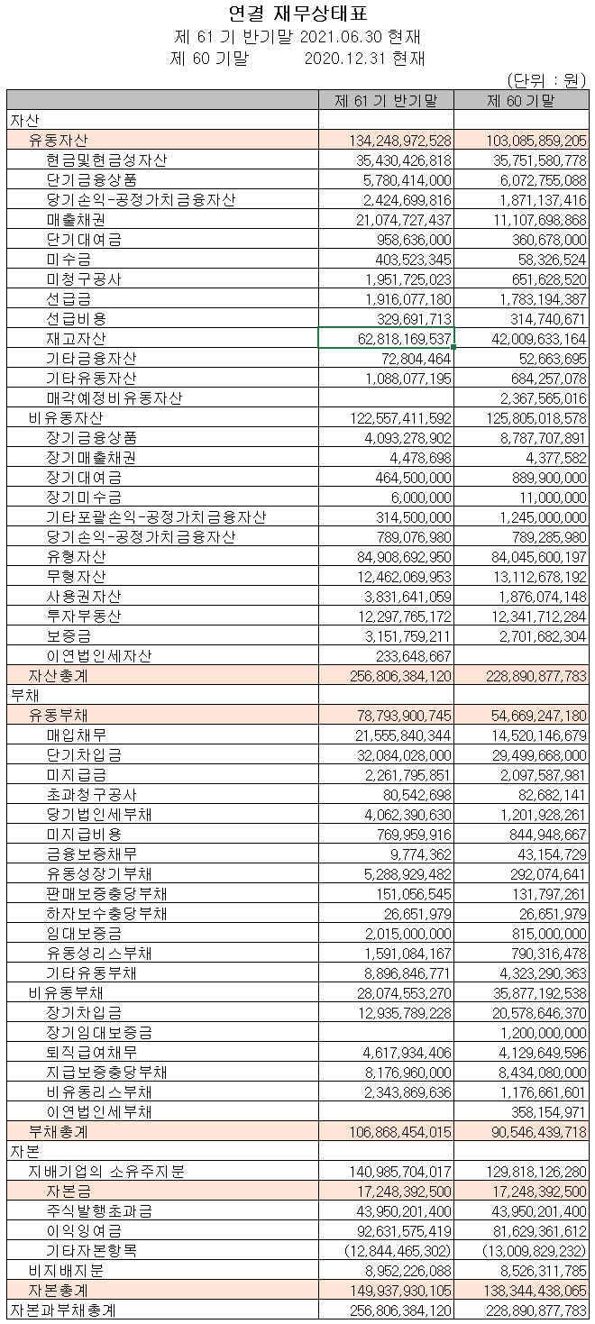 2021년 상반기 말 기준 자산총계는 전기 말보다 12.2% 증가한 2,568억 원으로 매출채권 및 재고자산의 증가에 기인합니다. 부채총계는 18% 증가한 1,069억 원으로 매입채무, 단기차입금 및 유동성장기부채 등의 증가에 따릅니다.