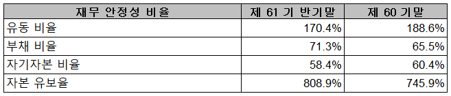 2021년 상반기 말 기준 재무 안정성 비율에서는 유동비율 170.4%, 부채비율 71.3%, 자기자본비율 58.4%, 자본유보율 808.9%를 기록했습니다.