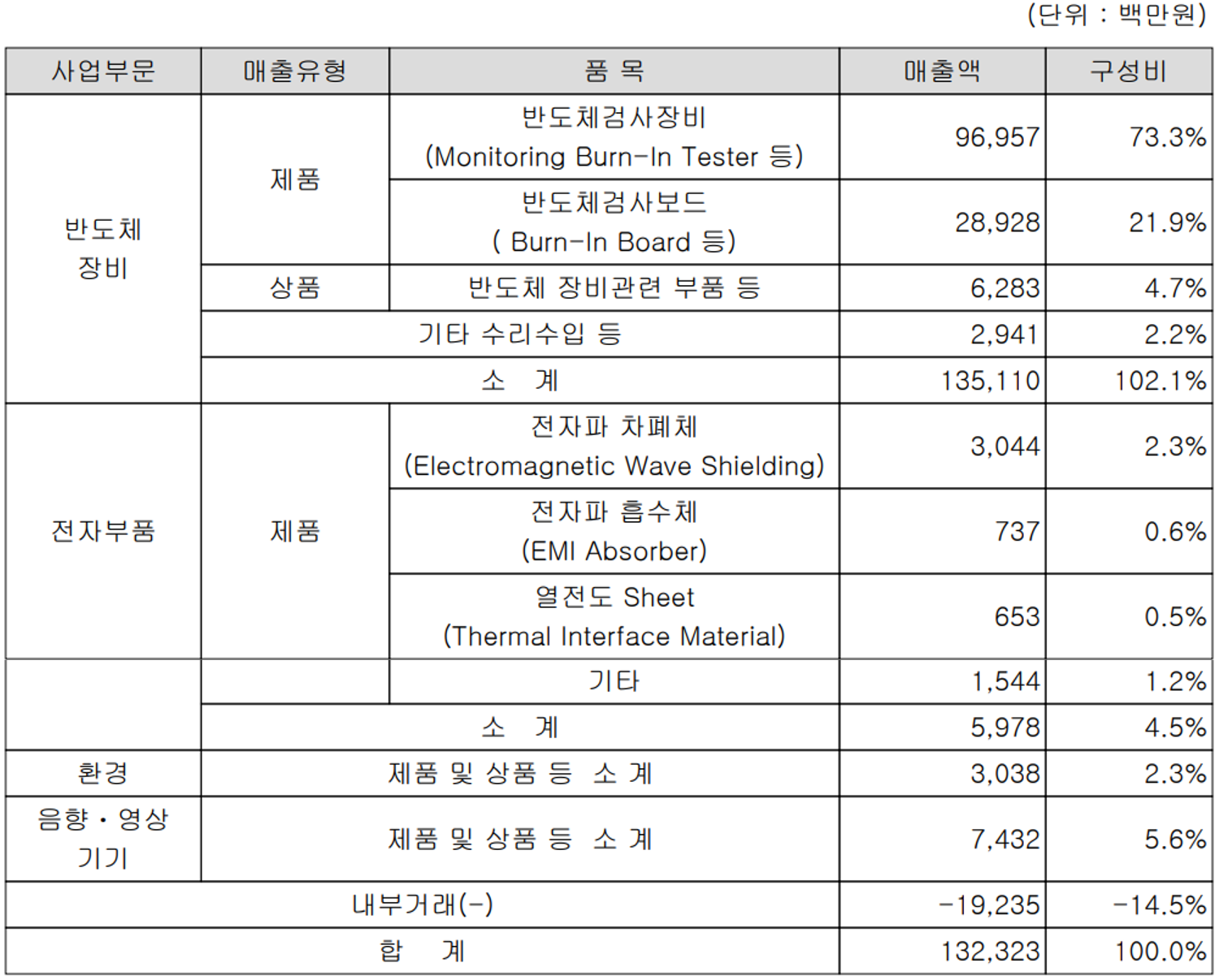 당사의 사업부문은 반도체 번인 테스터 등 검사장비, 번인 보드를 비롯한 검사용 PCB 등을 제조, 공급하는 반도체 장비 사업부문과 전자파 차폐제 및 흡수체 등을 제작하는 전자부품 사업부 그리고 환경 사업부문 및 음향/영상기기 사업부문 등으로 구성되어 있습니다. 지난 상반기 반도체 장비 사업부문의 매출은 1,351억 원으로 89.1%를 차지하였으며, 전자부품 사업의 매출은 60억 원으로 3.9%, 환경 부문은 30억 원으로 2%, 음향/영상 기기 사업부문의 매출은 74억 원으로 4.9%의 매출 비중을 기록했습니다.(내부거래 반영 전)