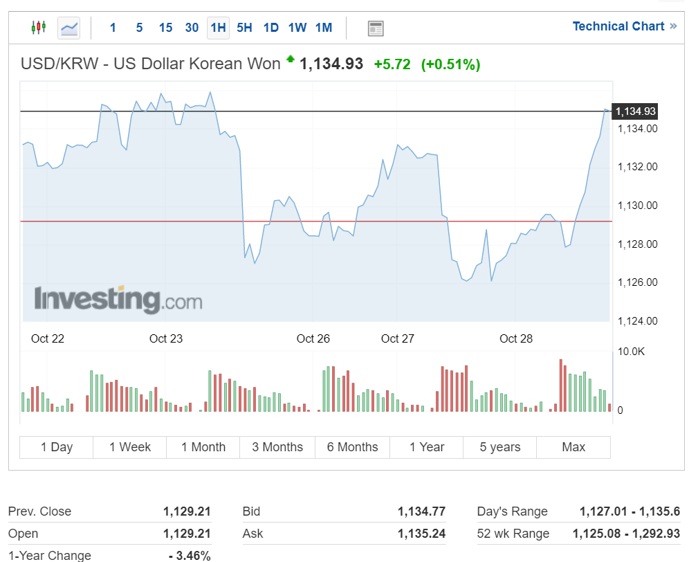 원달러 환율은 한국시간 오늘 장 초반부터 꾸준히 상승하여 현재 전일 대비 7원 오른 1134.93원을 기록하고 있습니다.