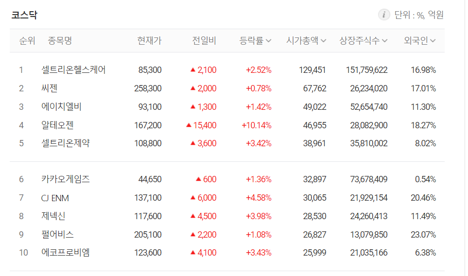 시가총액 상위 종목은 물론 전체 종목 중 1148개가 상승하고 하락한 종목은 141개 종목이었습니다.