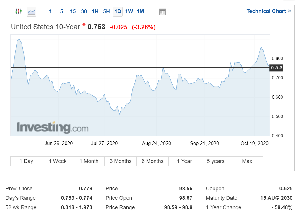 미국 국채 10년 물 금리는 최근 상승세가 주춤하면서 3 거래일 연속 하락세를 보이며 0.753을 기록하고 있습니다.