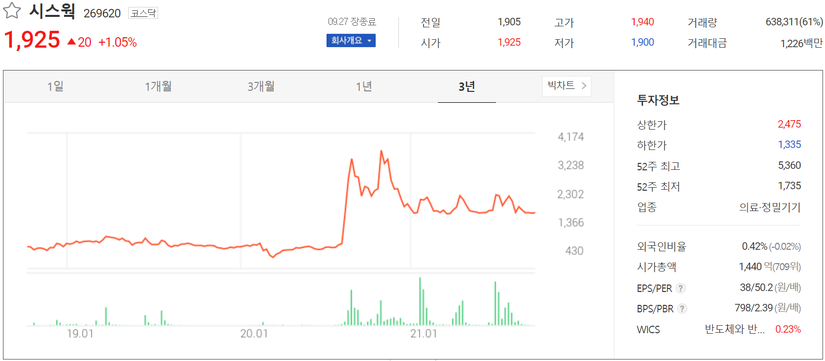 9월 27일 장 종료 기준 당사의 주가는 전 거래일보다 1.05% 오른 1,925원에 거래를 마쳤습니다. 외국인 비중은 0.42%이며, 시가 총액 1,440억 원으로 코스닥 시총 기준 709위 종목입니다.
