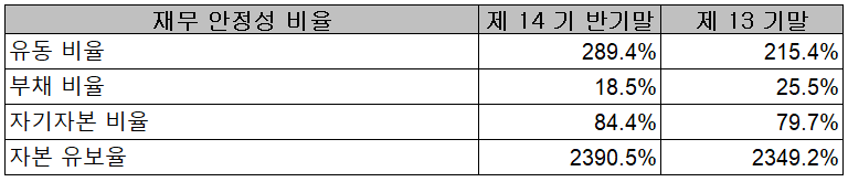 2021년 상반기 말 기준 재무 안정성 비율에서는 유동비율 289.4%, 부채비율 18.5%, 자기자본비율 84.4%, 자본유보율 2,390.5%를 기록하면서 건실하고, 안정적인 재무상태를 유지하고 있습니다.