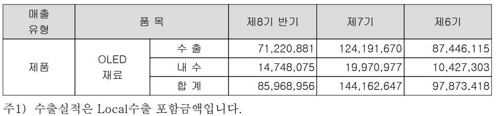 당사는 OLED 소재 단일 사업부문으로 세부적으로는 정공수송층인 HTL(Hole Transfer Layer)과 발광층의 Red Host, 발광층을 보조해주는 보조층 소재인 R Prime, G Prime 등을 주력으로 생산하고 있습니다. 지난 상반기 수출은 712억 원으로 전체 매출의 82.8%를 차지하였으며, 내수는 147억 원으로 17.2%의 매출 비중을 기록했습니다.