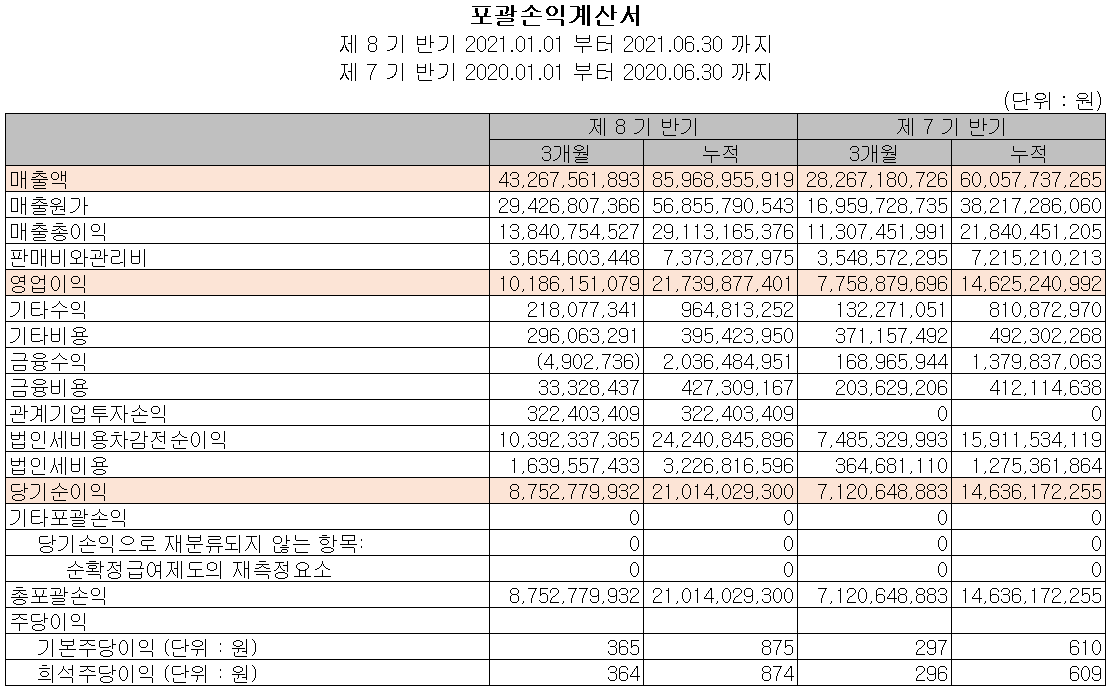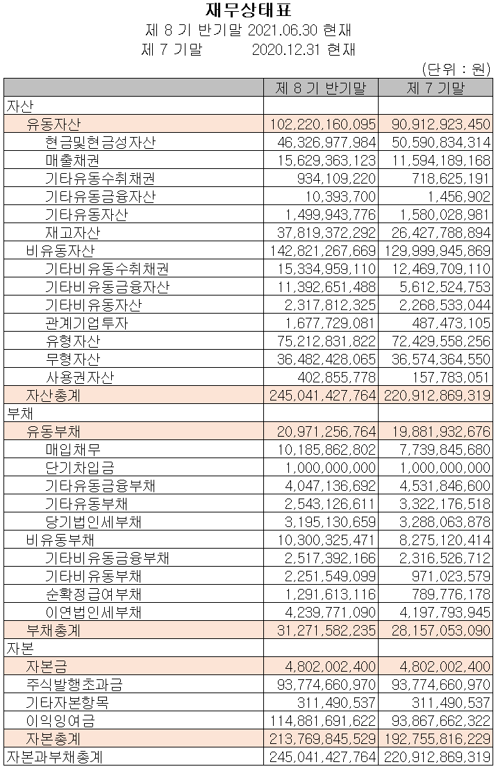 2021년 상반기 말 기준 자산총계는 전기 말보다 10.9% 증가한 2,450억 원으로 매출채권, 재고자산, 기타비유동금융자산, 관계기업투자 및 유형자산의 증가에 기인합니다. 부채총계는 11.1% 증가한 313억 원으로 매입채무 및 기타비유동부채의 증가에 따릅니다. 자본총계는 이익의 증가 등으로 210억 원이 늘어나면서 2,138억 원을 기록했습니다.